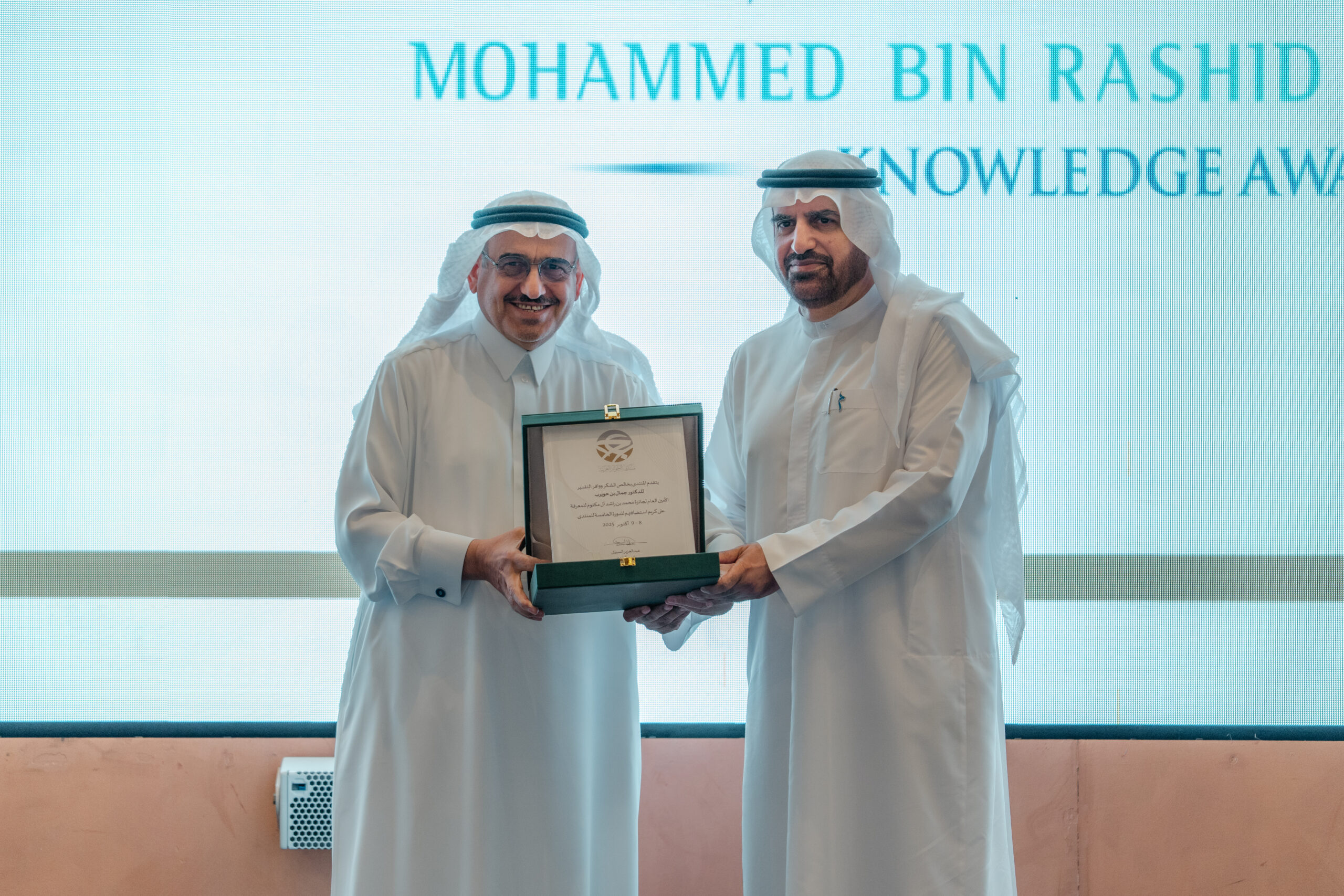 وخلال الحفل، أكد رئيس المنتدى الدكتور عبدالعزيز السبيّل في كلمته أن انعقاد الدورة الخامسة من الجوائز يمثل استمرارًا لمسيرة التعاون والتكامل بين المؤسسات العربية، ويعكس إيمان المنتدى بأهمية تقدير الإسهامات الثقافية والمعرفية في تعزيز التنمية المستدامة. كما عبّر عن شكر المنتدى وامتنانه لمؤسسة محمد بن راشد آل مكتوم للمعرفة على جهودها في دعم المبادرات الثقافية والمعرفية، وعلى حسن التنظيم والضيافة.