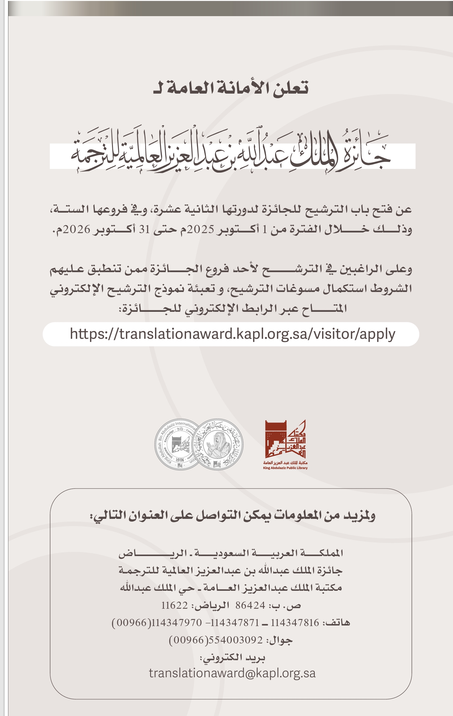تعلن الأمانة العامة لجائزة الملك عبدالله بن عبدالعزيز العالمية للترجمة عن فتح باب الترشيح للجائزة لدورتها الثانية عشرة، وفي فروعها الستة، وذلك خلال الفترة من 1 أكتوبر 2025م حتى 31 أكتوبر 2026م.
